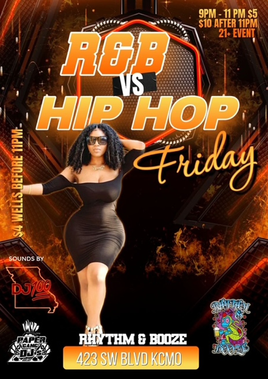 Join DJ 100 & all your friends at Rhythm & Booze every Friday night for the BEST R&B v HipHop Show in town featuring DJ 100 on the 1's n 2's! Drink & Food Specials till 11pm! Valid ID to enter, 21+ only